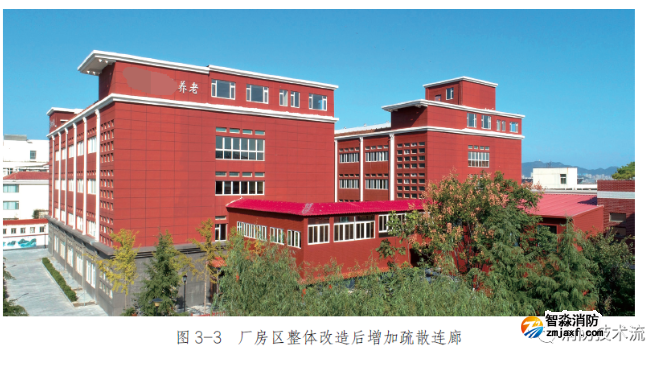 原建筑消防設(shè)施設(shè)置較少,根據(jù)現(xiàn)狀增設(shè)消防設(shè)施困難。本工程將工業(yè)廠房、倉儲(chǔ)用房等改造為老年人照料設(shè)施,屬于既有建筑改變使用功能的情況,需要由所在轄區(qū)規(guī)劃主管部門出具變更證明文件后,辦理建設(shè)和消防手續(xù)。2. 建筑主體承重結(jié)構(gòu)變動(dòng),結(jié)構(gòu)荷載增大的應(yīng)對措施改造單位委托具有相應(yīng)資質(zhì)的機(jī)構(gòu)進(jìn)行檢測和鑒定,保障建筑改造不會(huì)產(chǎn)生結(jié)構(gòu)安全隱患。結(jié)合建筑現(xiàn)狀,增設(shè)安全出口和疏散出口,增加排煙窗與消防救援窗,廠房區(qū)、辦公區(qū)增加疏散連廊(圖3-3、圖3-4)。